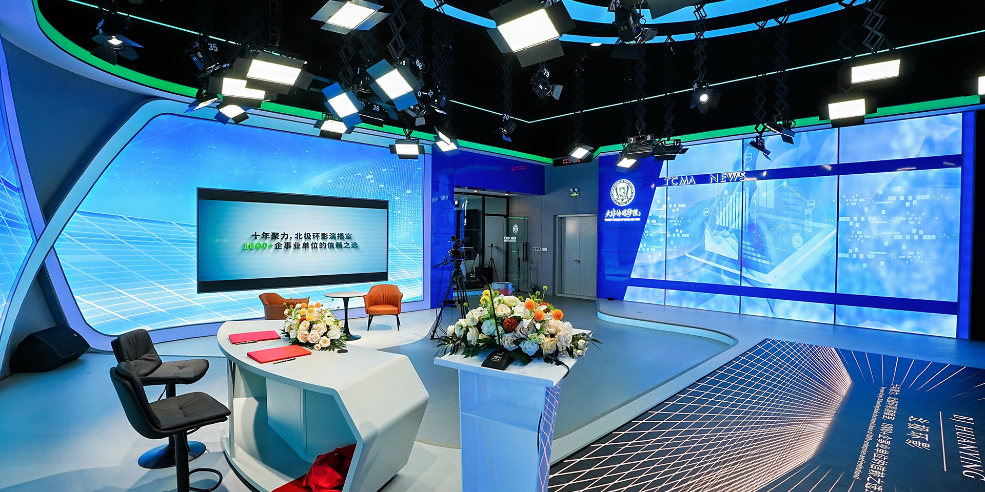 基于"模块化设计、专业化配置、智能化应用"的规划理念,整个演播室科学划分为XR虚拟演播区、电视新闻节目录播区、访谈节目坐播区、专题节目站播区、新媒体节目直播区五大功能区域,构建了完善的现代传媒实践教学体系。